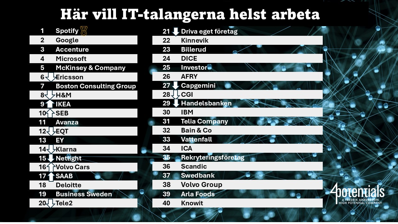 Av konsultbolagen är Accenture bäst år efter år. För bankerna är IT affärskritiskt och här har SEBs arbete år efter år givit resultat. För tio år sedan när 4potentials började mäta var IT-talangerna ville arbeta så var Google och Ericsson i toppen och Spotify var nr 10. Det är oerhört imponerande den resa som Spotify gjort avseende att bygga ett varumärke dit nästan alla inom IT-området vill.