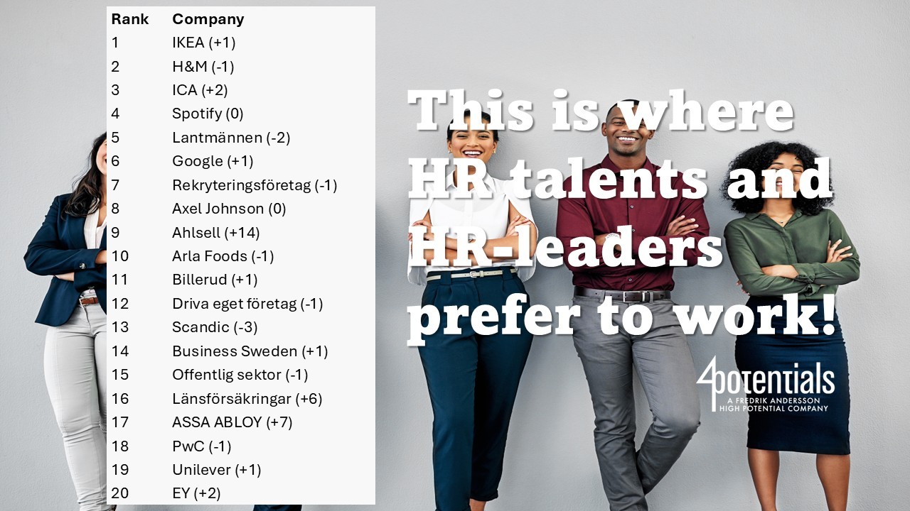 Unilever och EY tar även lite steg framåt. Och det finns fler bolag som kommer starkt bland de som är rankade 21-50. Bland annat har Coop, Swedbank, Orkla, Trelleborg, Essity, Inwido, EQT mycket spännande saker på G inom HR.